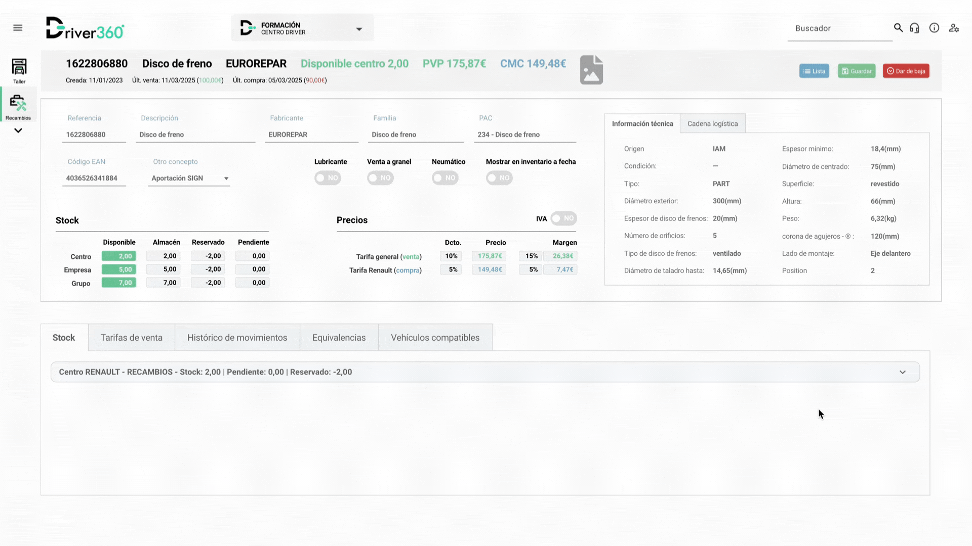- Transparencia en compras: acceda al historial de compras detallado y, por primera vez, incorpora el precio de compra y descuento en fichas de material no Renault, unificando la gestión de todo su inventario.